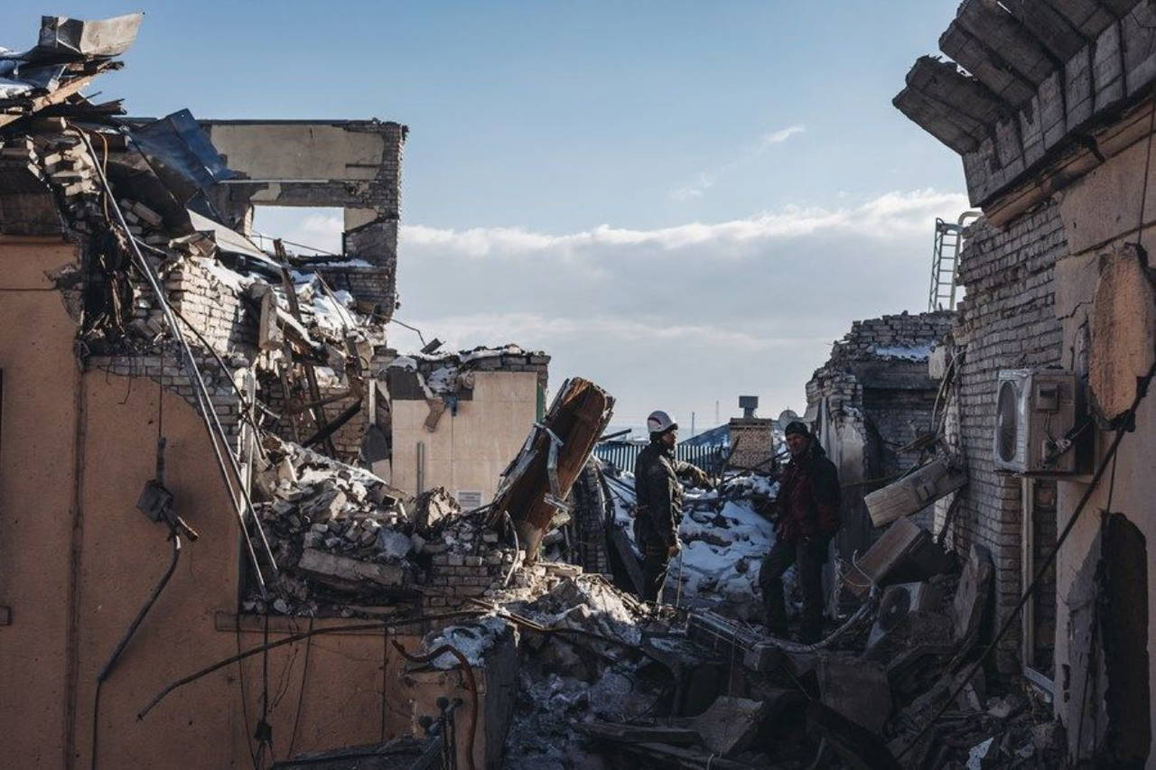 Ukrayna'nın Harkov kentinde bir bina yakınlarında çalışan itfaiyeciler, 13 Mart 2022. (Fotoğraf: Diego Herrera/Xinhua)