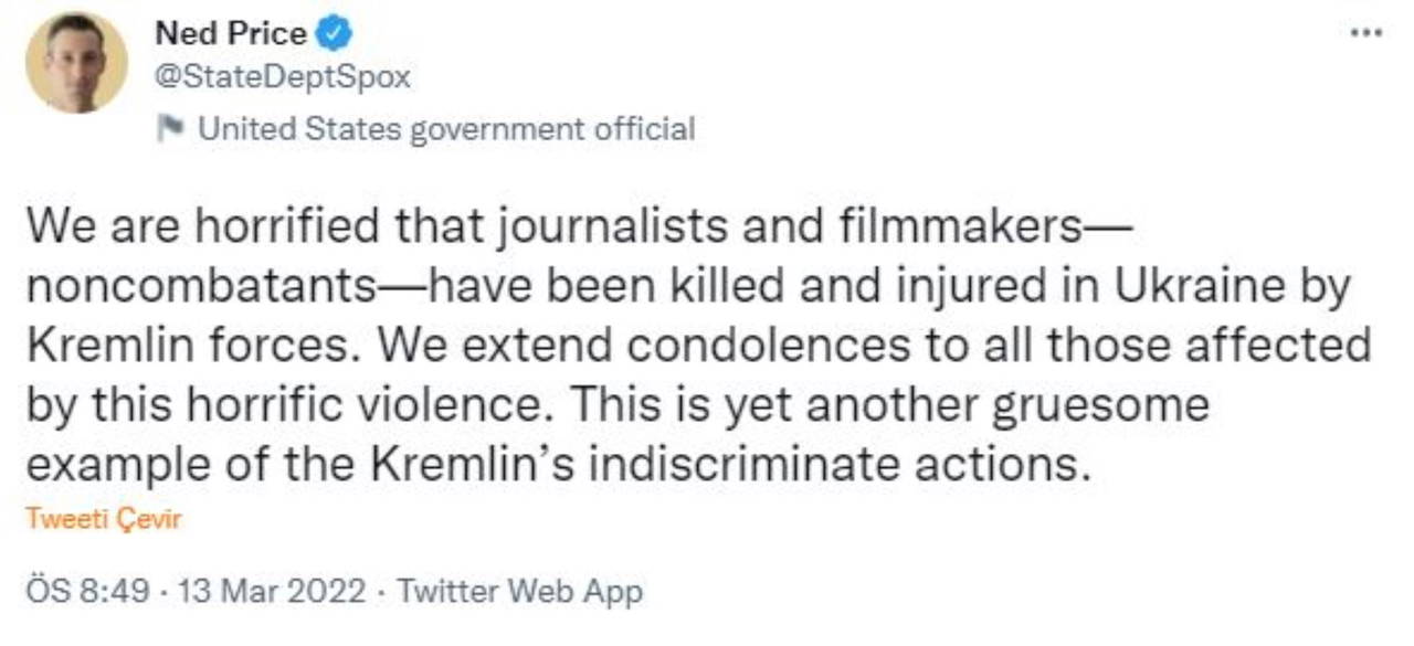 ABD Dışişleri Bakanlığı Sözcüsü Ned Price, Ukrayna’da ABD’li gazeteci Brent Renaud’un Rus birlikleri tarafından açılan ateş sonucu hayatını kaybetmesine ilişkin sosyal medya hesabı üzerinden yaptığı açıklamada, “Gazetecilerin ve film yapımcılarının (savaşçı olmayanların) Ukrayna'da Kremlin güçleri tarafından öldürülmesi ve yaralanması bizi dehşete düşürdü. Bu korkunç şiddetten etkilenen herkese taziyelerimizi iletiyoruz. Bu, Kremlin'in ayrım gözetmeyen eylemlerinin bir başka korkunç örneğidir” ifadelerini kullandı.