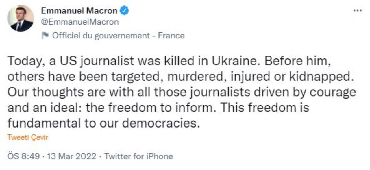 Fransa Cumhurbaşkanı Emmanuel Macron Renaud’un öldürülmesiyle ilgili olarak, “Ukrayna’da ABD’li bir gazeteci öldürüldü. Ondan önce başkaları hedef alındı, öldürüldü, yaralandı ya da kaçırıldı. Düşüncelerimiz bilgilendirme özgürlüğü ideali ve cesaretle hareket eden tüm gazetecilerle. Bu özgürlük demokrasilerimiz için esastır” dedi.