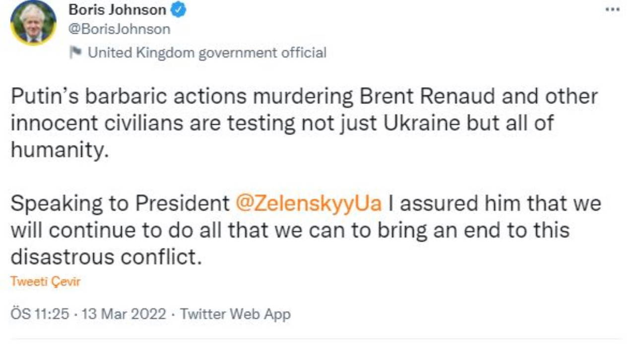 İngiltere Başbakanı Boris Johnson da ABD’li gazeteci Renaud’un öldürülmesine ilişkin yaptığı sosyal medya paylaşımında, “Putin’in Brent Renaud’u ve diğer masum siviller katleden barbarca eylemleri sadece Ukrayna’yı değil tüm insanlığı test ediyor” dedi. Ayrıca Johnson, Ukrayna Devlet Başkanı Volodimir Zelenskiy ile konuştuğunu ve bu çatışmaya bir son vermek için ellerinden gelen her şeyi yapmaya devam edeceklerine dair ona güvence verdiğini ifade etti.
