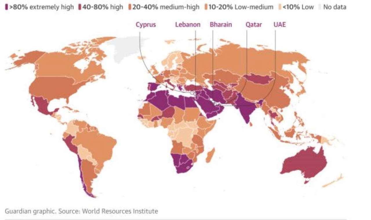 En fazla su sıkıntısı çeken 25 ülke arasında Suudi Arabistan Şili, San Marino, Belçika ve Yunanistan bulunuyor. En yüksek su talebiyle karşı karşıya olan beş ülke ise Bahreyn, Kıbrıs, Kuveyt, Lübnan ve Umman.