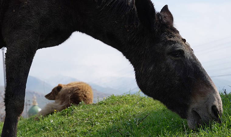 Köpek ile çevredeki hayvanlara ve tehlikelere karşı koruduğu katır arasındaki yakınlık bölge halkının ilgisini çekiyor.