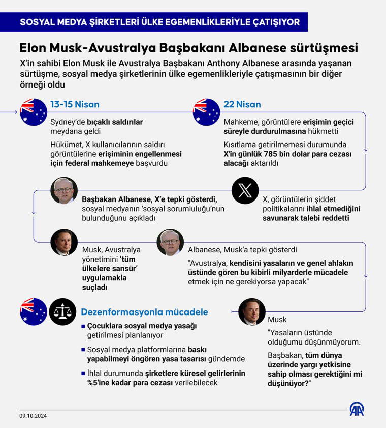 "Sosyal medya şirketleri ülke egemenlikleriyle çatışıyor" başlıklı dosya haberin dördüncü bölümünde, bıçaklı saldırılara ilişkin görüntülerin kaldırılması tartışmasıyla başlayan Musk-Albanese çekişmesi ele alındı.