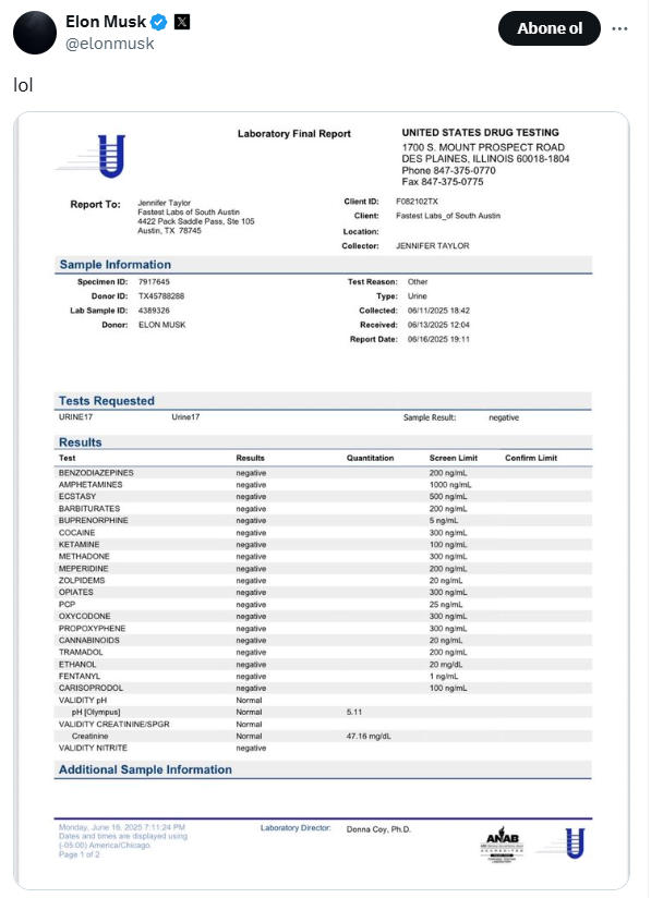 Bu kez daha somut bir adım atan Musk, iddiaları çürütmek için bu ay içinde Teksas'ta Fastest Labs laboratuvarında verdiği idrar testinin sonuçlarını X hesabında paylaştı.