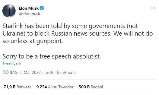 Musk, bu çağrılara olumlu yanıt vermediğini belirterek “Starlink'e bazı hükümetler (Ukrayna hariç) tarafından Rus haber kaynaklarını engellemesi söylendi. Silah zoruyla olmadıkça bunu yapmayacağız. Özgür konuşma mutlakiyetçisi olduğum için üzgünüm” ifadelerini kullandı.