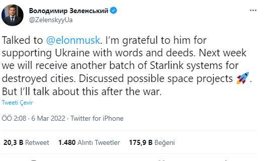 Ukrayna Devlet Başkanı Volodimir Zelenski dün akşam yaptığı açıklamada Elon Musk ile telefonda görüştüğünü belirterek “Ukrayna'yı sözleri ve eylemleriyle desteklediği için ona minnettarım. Gelecek hafta, yok edilen şehirler için başka bir Starlink sistemi grubu alacağız” dedi. Elon Musk, geçen hafta Ukrayna’nın internet altyapısının kesintiye uğramaması için Starlink uydu terminalleri göndermişti.