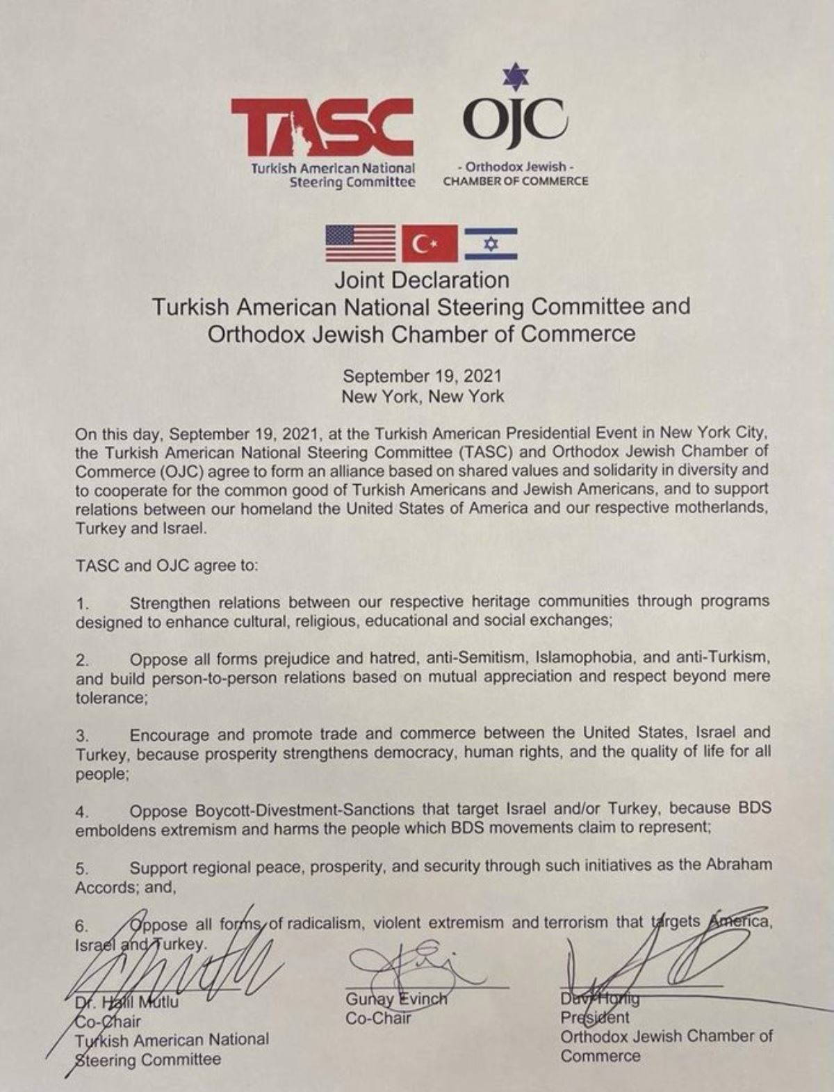 “19 Eylül 2021 tarihinde, New York'ta düzenlenen Türkiye ve Amerikan Başkanlığı etkinliğinde Türk Amerikan Ulusal Yönlendirme Komitesi (TASC) ve Ortodoks Yahudi Ticaret Odası (OJC), ortak değerlere ve dayanışmaya dayalı bir ittifak oluşturma ve ortak çeşitlilikte işbirliği ve Türk Amerikalıların ve Yahudi Amerikalıların iyiliğine ve anavatanımızı ve Amerika Birleşik Devletleri'ni ve anavatanımız İsrail'i ve Türkiye'yi desteklemek için bir anlaşmaya varmıştır.