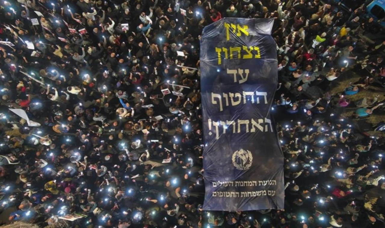 Esirler ve Kayıp Kişilerin Aileleri Forumu tarafından organize edilen protesto için esir yakınları, İsrail’in başkenti Tel Aviv’de bulunan Kirya Askeri Üssü’nün önünde toplandı. Esirlerin serbest bırakılması çağrısında bulunan göstericiler, ellerinde esirlerin fotoğraflarını taşıdı.