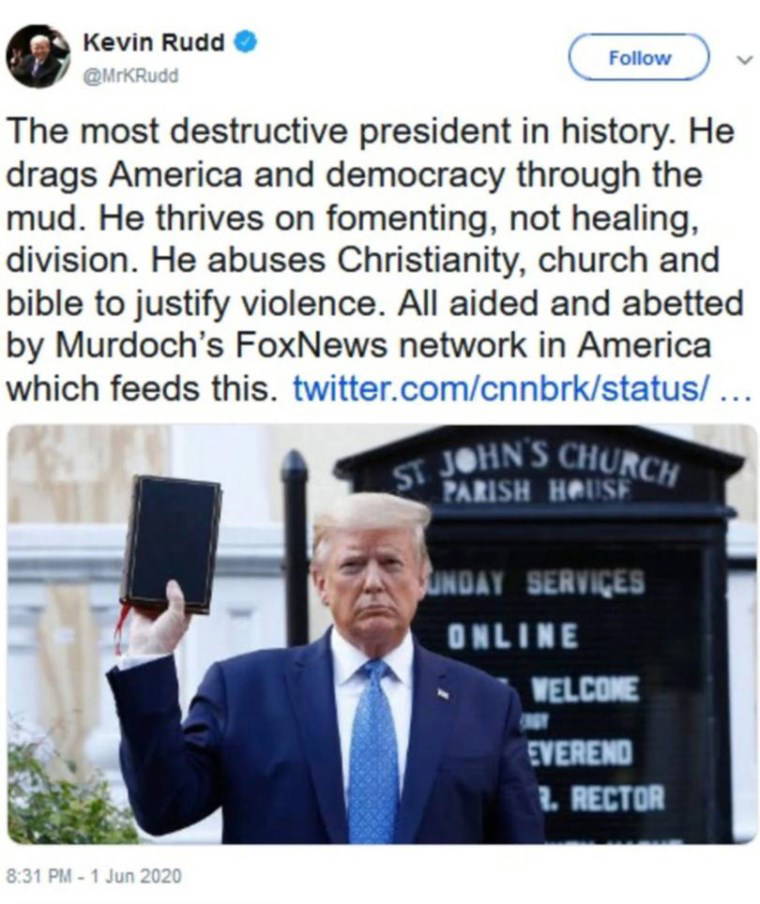 Sky News Australia tarafından ekran görüntüsü alınan Haziran 2020 tarihli ve artık silinmiş bir gönderide Rudd, Washington Piskoposluk Bölgesi Piskopos'unun bir İncil ile “Trump'ın fotoğraf çektirmesine nasıl öfkelendiğini” anlatan bir paylaşıma yanıt veriyordu.