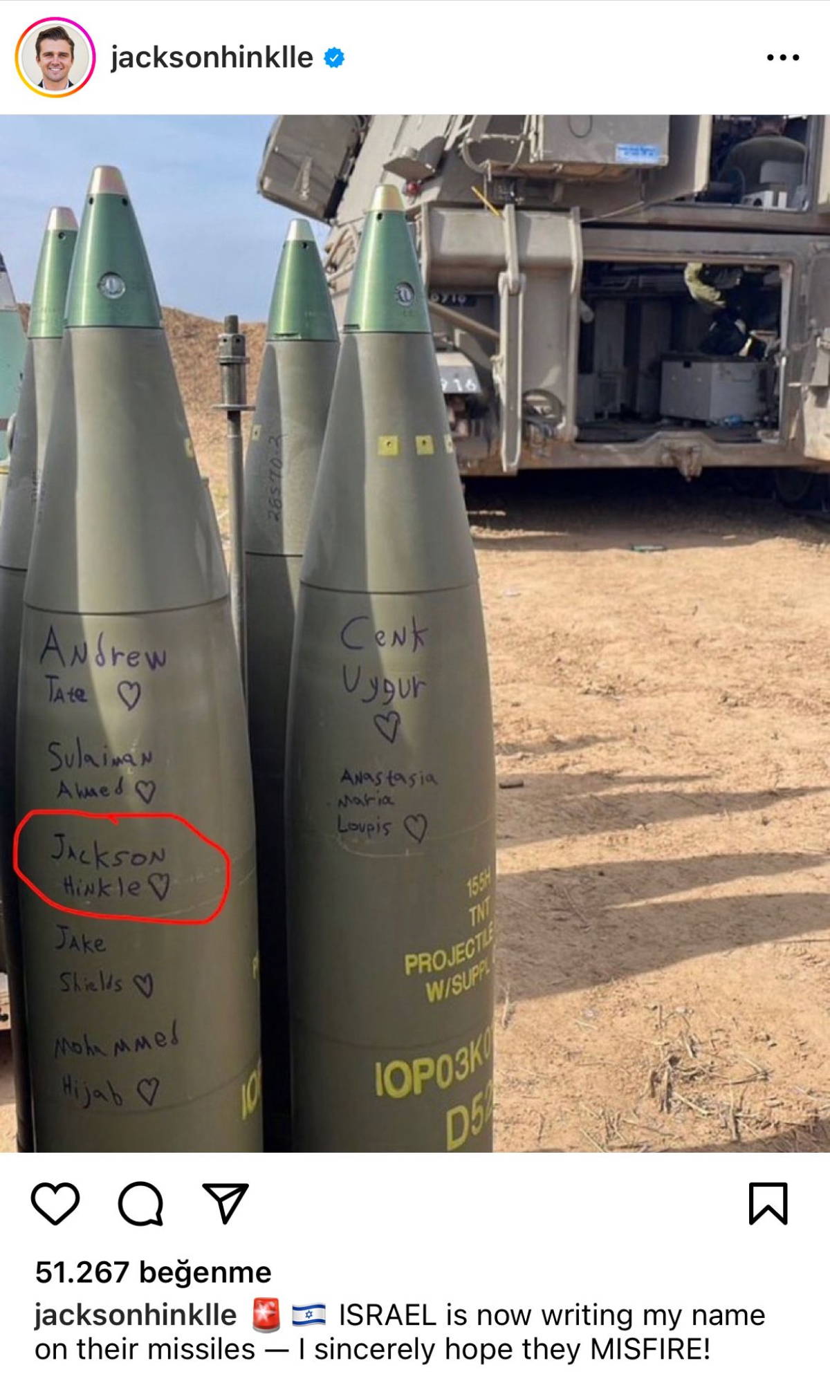 ABD'li siyaset yorumcusu ve sosyal medya fenomeni Jackson Hinkle, Instagram hesabından söz konusu görüntülere tepki gösterdi. 24 yaşındaki sosyal medya fenomeni, "İsrail füzelerinin üzerine benim adımı yazıyor, umarım tutukluk yapar" diye yazdı.