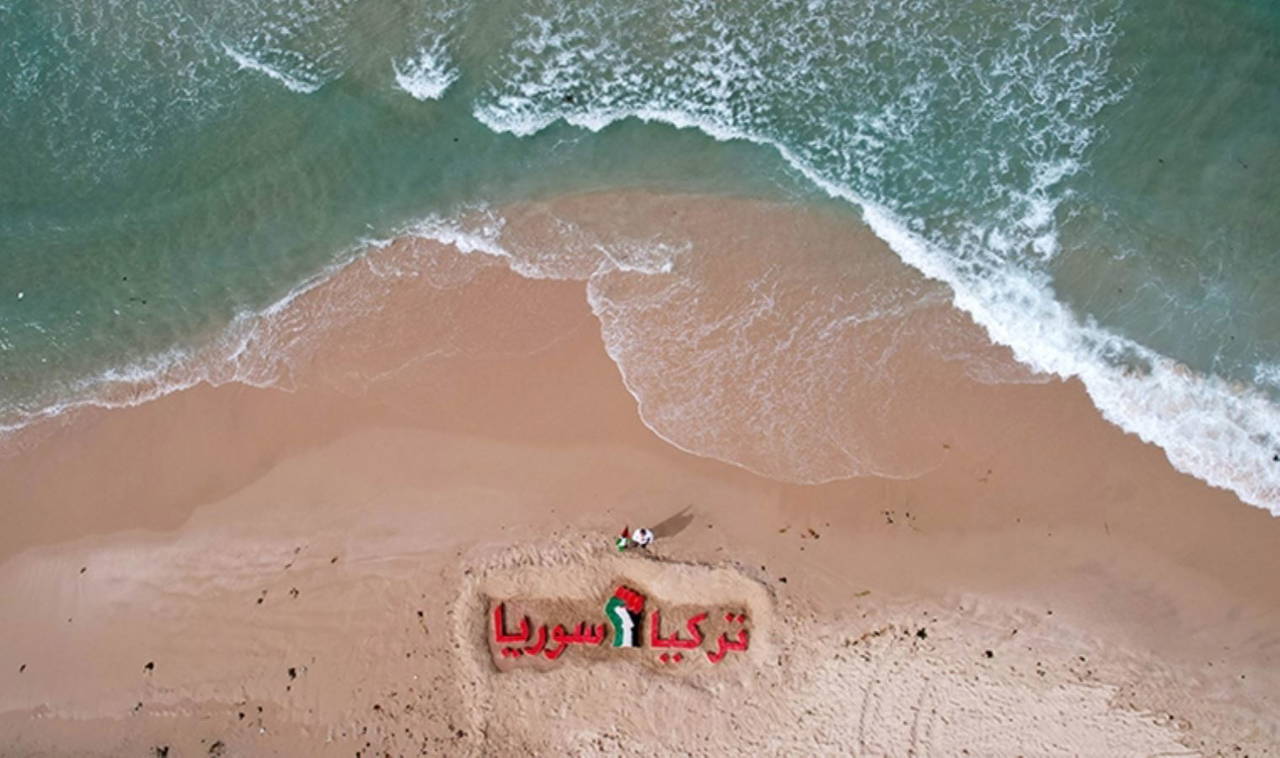"Türkiye" ve "Suriye" yazılarının yanı sıra Filistin bayrağı renkleriyle boyadığı yumruk sembolünü de kumlara çizen Tavtah, Türk ve Suriye halklarının başına gelen trajediyi bir dayanışma tablosuyla somutlaştırdığını söyledi.