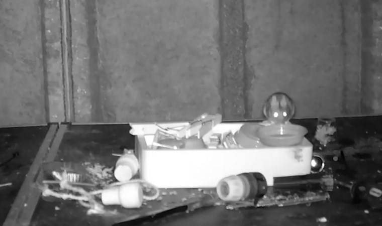 Guardian'ın yayımladığı gece görüşlü görüntülerde, vicdanlı görünen kemirgenin mandalları, mantarları, somunları ve cıvataları toplayıp Holbrook'un tezgahındaki bir tepsiye yerleştirdiği görülüyor.
