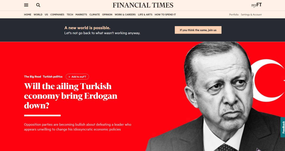 İngiliz Financial Times gazetesi mevcut durumdaki Türkiye ekonomisini ve Cumhurbaşkanı Erdoğan'ın hamlelerini kaleme alarak kapsamlı bir analiz hazırladı. Analizde AKP içinden ismi belirtilmeyen kaynakların da görüşlerine yer verildi.
