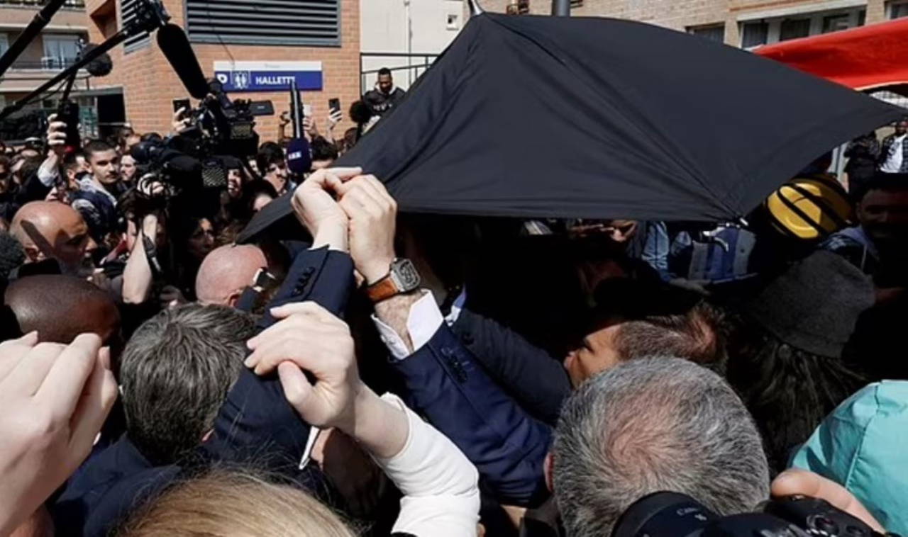 Fransa Cumhurbaşkanı Emmanuel Macron, seçim zaferinden sadece birkaç gün sonra Paris'in kuzeybatısındaki Cergy'deki bir pazarda halkla sohbet ettiği sırada domates yağmuruna tutuldu.