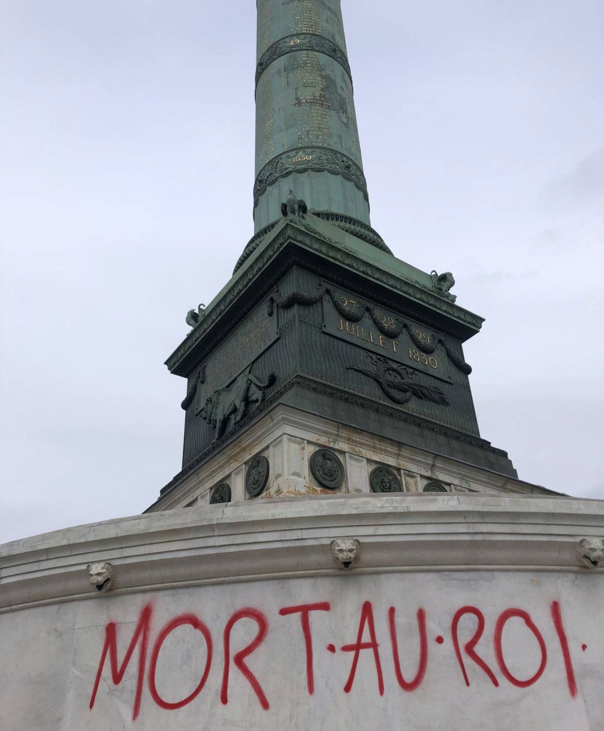 Eylemciler, gerçekleştirdikleri protestolarda "Macron'un kafasını kes" ve "Krala ölüm" sloganları atarak, bazı yerleri spreyle boyadılar.
