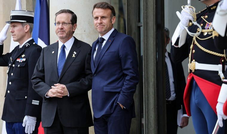Caron, X hesabından yaptığı paylaşımda, Macron'un İsrailli mevkidaşını Elysee Sarayı'nın kapısında karşıladığı, sarıldığı ve kameralara poz verdiği görüntüleri alıntıladı.