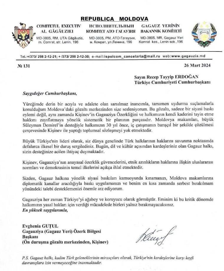 Mektupta, Türkiye’nin 1994 yılında Moldova ile Gagauz Özerk Yeri arasında yapılan anlaşmada arabulucu rolü üstlendiğini hatırlatan Gutsul, “Kişinev yönetimi bu anlaşmaları çiğniyor, uluslararası hukuk ilkelerini açıkça ihlal ediyor” ifadelerini kullandı.