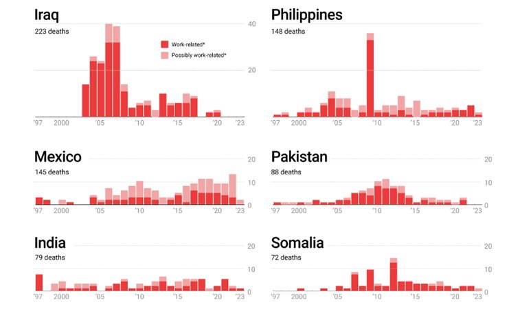 CPJ'nin 2023 verileri; Irak, Filipinler, Meksika, Pakistan, Hindistan ve Somali gibi ülkelerde gazetecilerin hedef alınmasının değişmediğini gösterdi.