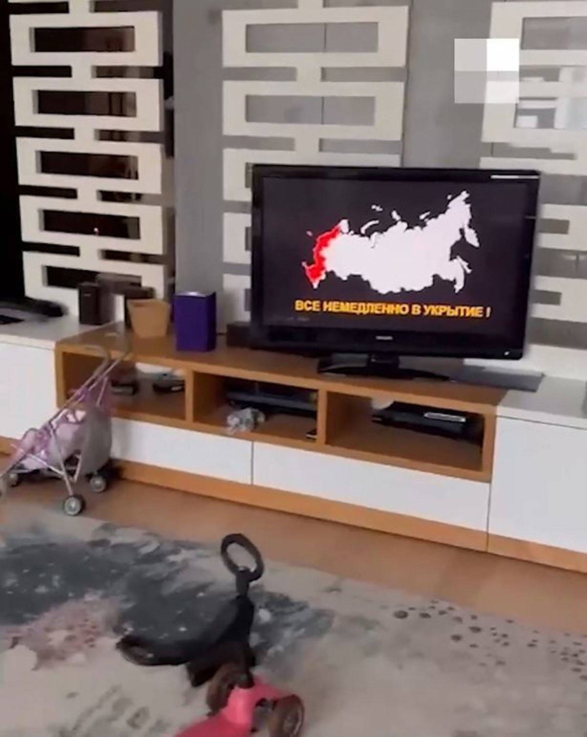 Mesaj esnasında ekranda, kırmızı gölgelerle kademeli olarak kaplanan bir Rusya haritasını gösterilirken, "Herkes derhal sığınağa" ifadeleri yer aldı.
