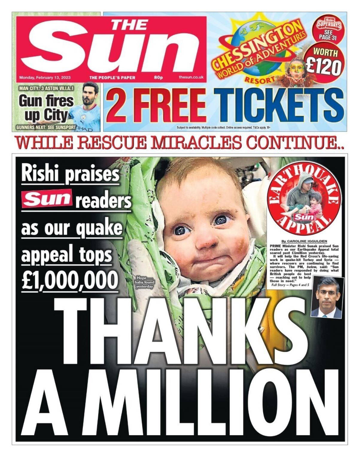 The Sun, "Bir milyon teşekkürler" başlığı altında, İngiltere'deki depremzedeler için insani yardım kapsamında toplanan 1 milyon Euro'ya dikkat çekti.