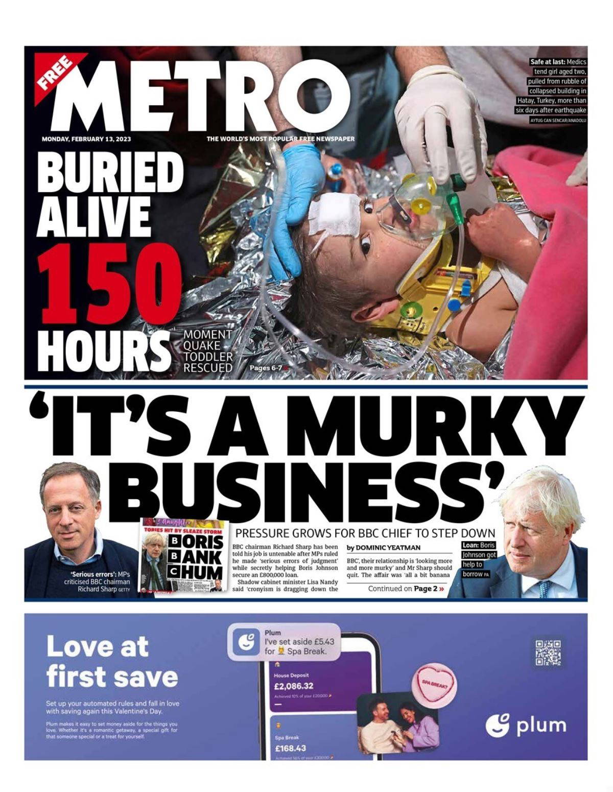 Metro, "150 saat canlı gömüldü" başlığında enkaz altından kurtarılan bir küçük kızın fotoğrafını manşete taşıdı.
