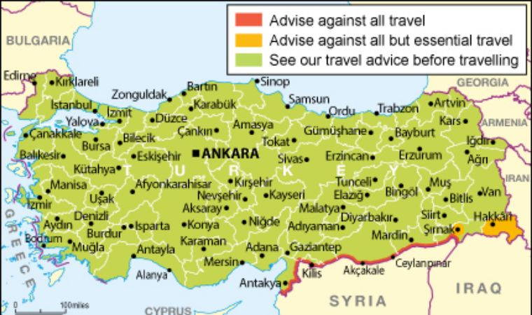 İngiltere Dışişleri Bakanlığı, 1 Mayıs’ta yayınladığı yeni Türkiye seyahat rehberinin girişinde ”Türkiye'nin bazı bölgelerine seyahat edilmesini tavsiye etmemektedir” ibaresini kullandı.