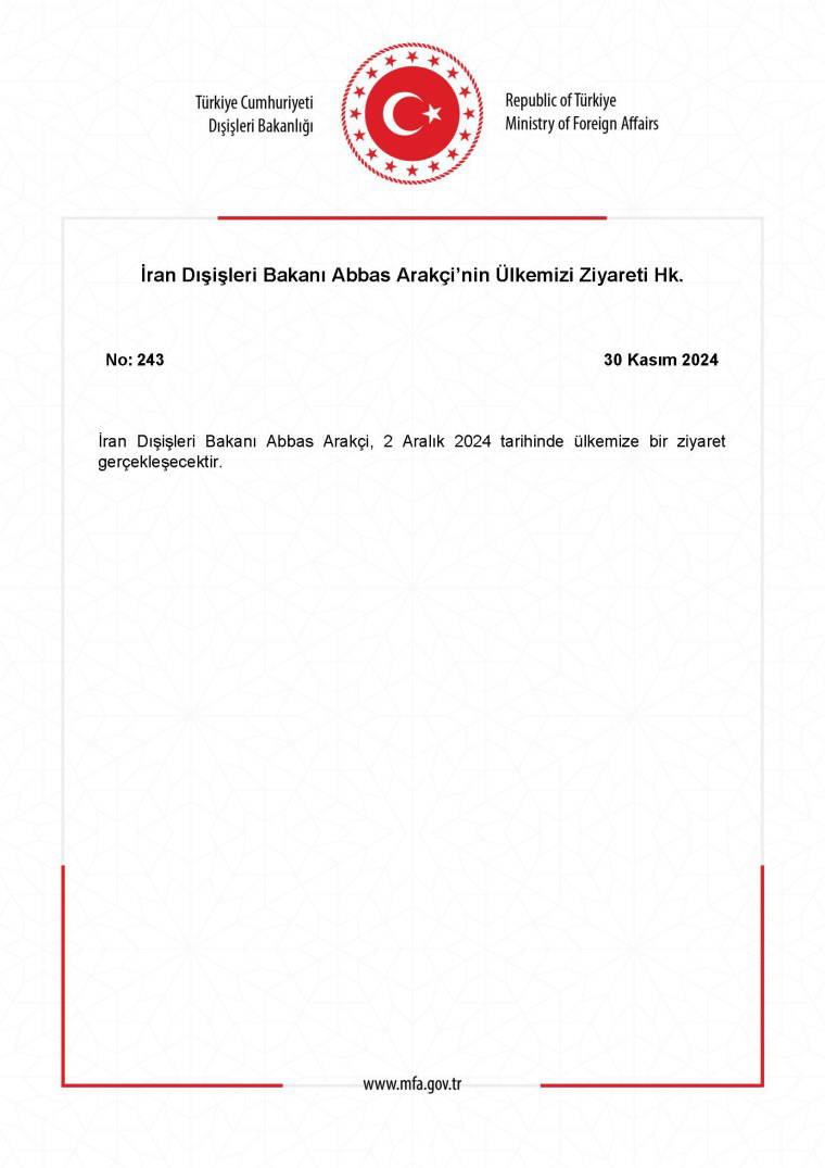 Açıklamaya göre, İran Dışişleri Bakanı Abbas Arakçi 2 Aralık 2024 tarihinde Türkiye'ye ziyaret gerçekleştirecek.