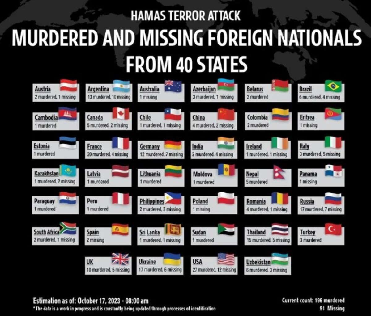 40 ülkeden 196 kişi öldürüldüğü ve 91 kişinin kayıp olduğunun belirtildiği listede, Hamas saldırılarında hayatını kaybeden Türk vatandaşı sayısının 3'e çıktığı bilgisi yer aldı.
