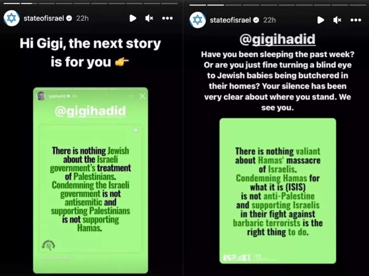 İsrail hükûmetinin resmi Instagram hesabından yapılan paylaşımda, Hadid'e yönelik "Bir haftadır rahat uyuyor musun Gigi? Ya da evlerinde katledilen Yahudi bebeklere gözünü mü kapıyorsun? Sessizliğin durduğun yeri çok iyi gösteriyor. Seni görüyoruz" ifadeleri yer aldı.
