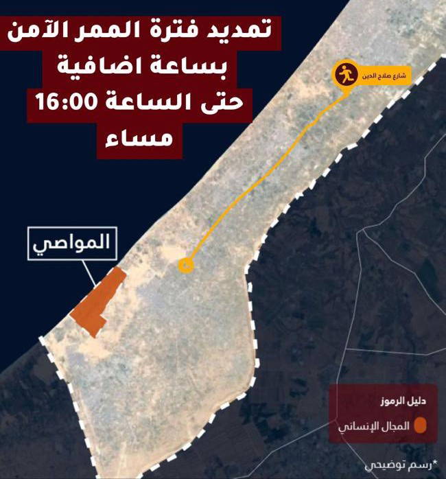 İsrail Savunma Kuvvetleri’nin (IDF) bugün yaptığı açıklamasında, “Tahliye koridoru, Gazze Vadisi'nin güneyine doğru Selahaddin ekseni üzerinden 09.00-16.00 saatleri arasında sivillere açık kalacak. Selahaddin Ekseni üzerinden güneye doğru tahliyeyi teşvik etmek amacıyla bugün saat 10:00-14:00 arasında Cibaliye Mülteci Kampı bölgesinde askeri operasyona taktiksel bir ara verilecek” denildi.