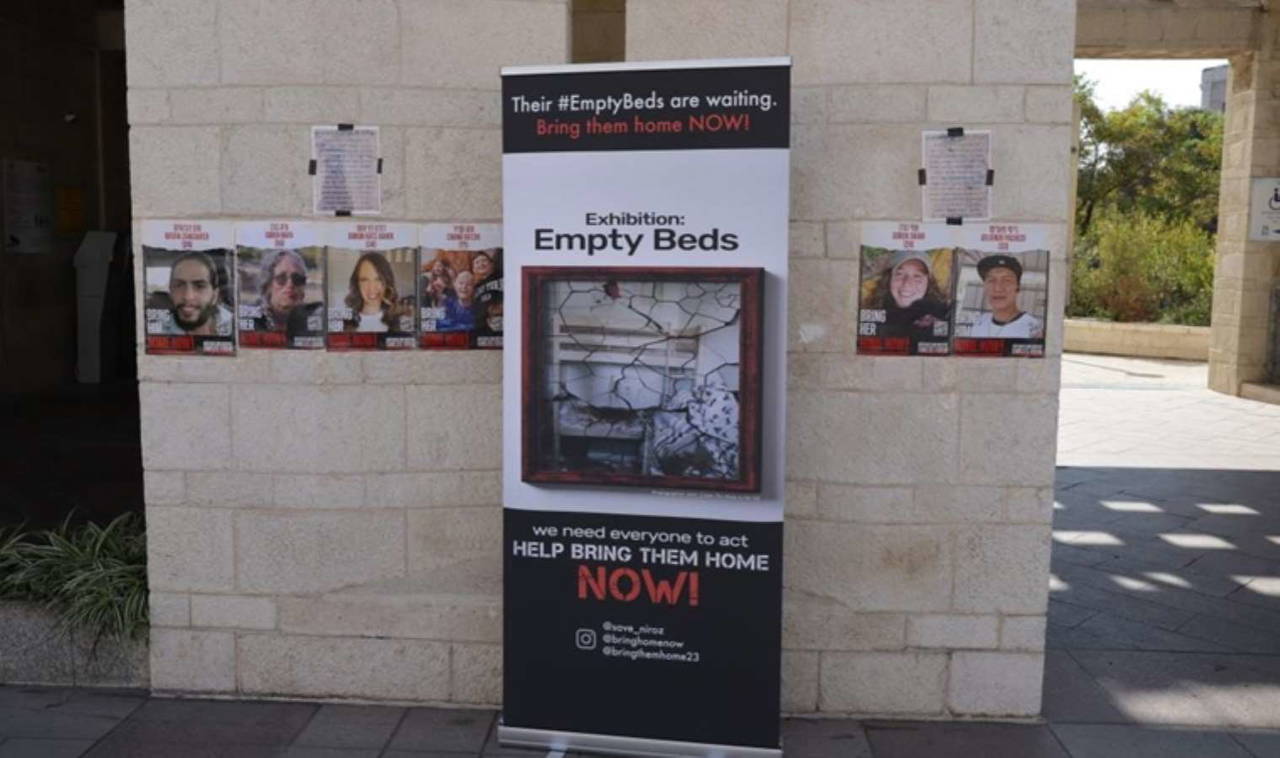 Gazze’ye kaçırılan rehinelerin sayısı kadar yatak yerleştiren protestocular, Gazze’de bulunan rehinelerin fotoğraflarını da yataklara astı.