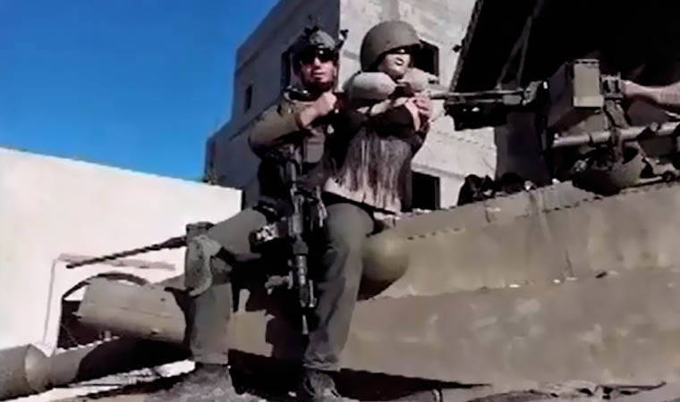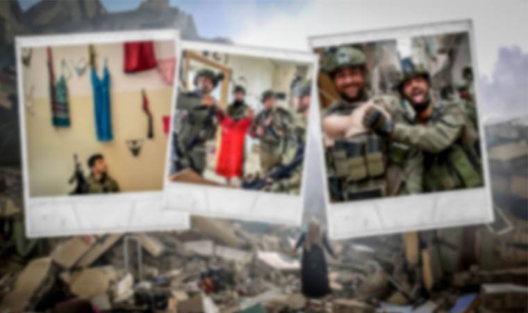 İsrail askerleri tarafından paylaşılan videoda bir asker, işgal altındaki Gazze'deki bir evde, bir elinde sırıtarak silahını tutarken, diğer elindeki kadın iç çamaşırını koltukta yatan arkadaşının açık ağzına sarkıttı.