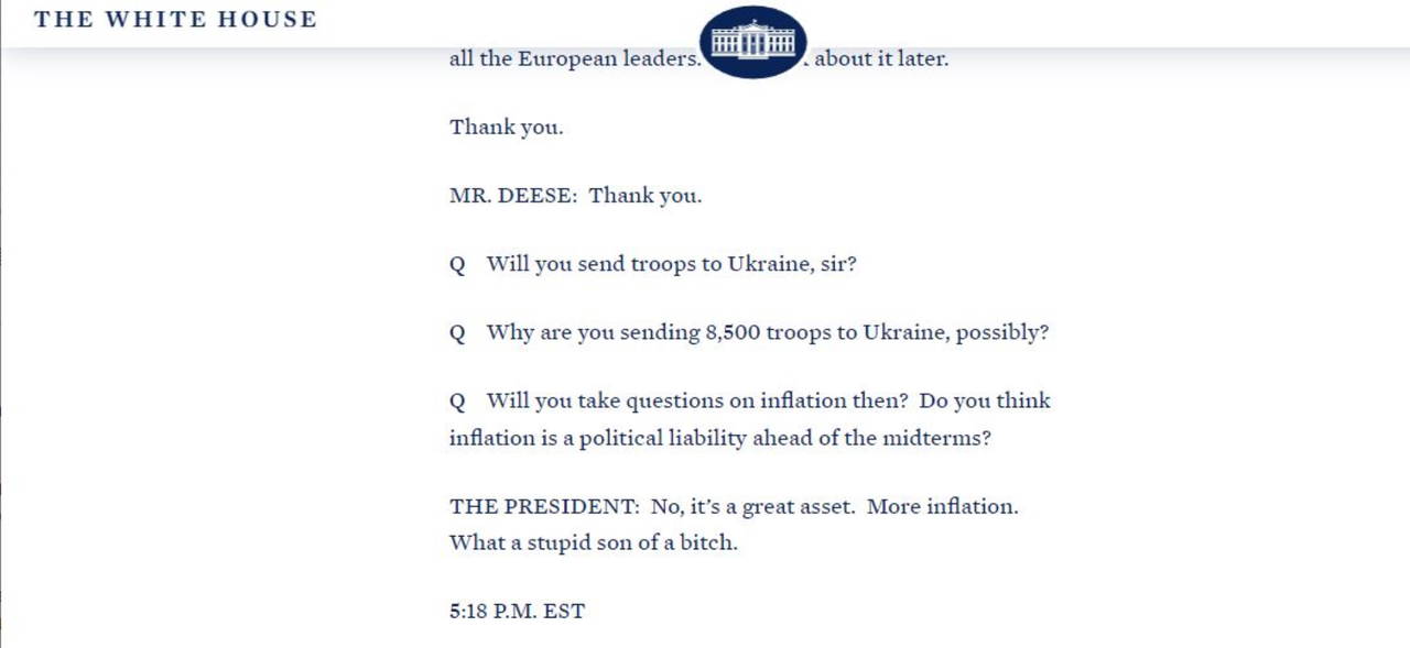 Mikrofonu açık olan Biden ise, "Hayır, daha fazla enflasyon bence bizim için mükemmel bir kazanç. Ne aptal bir o..... çocuğu" diye yanıt verdi. Ayrıca Biden’ın küfürü Beyaz Saray'ın toplantı için aldığı deşifrede de yer aldı.