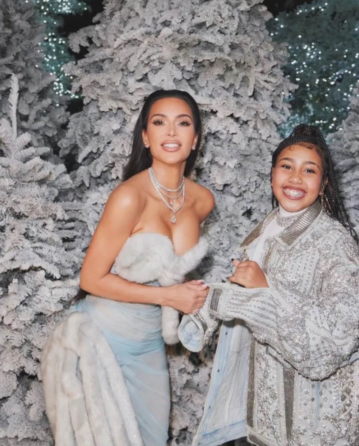 Fotoğraflardan birinde Kim ve kızı North, Noel ağacının önünde, beyaz ve açık mavi kıyafetler içinde gülümsüyordu.