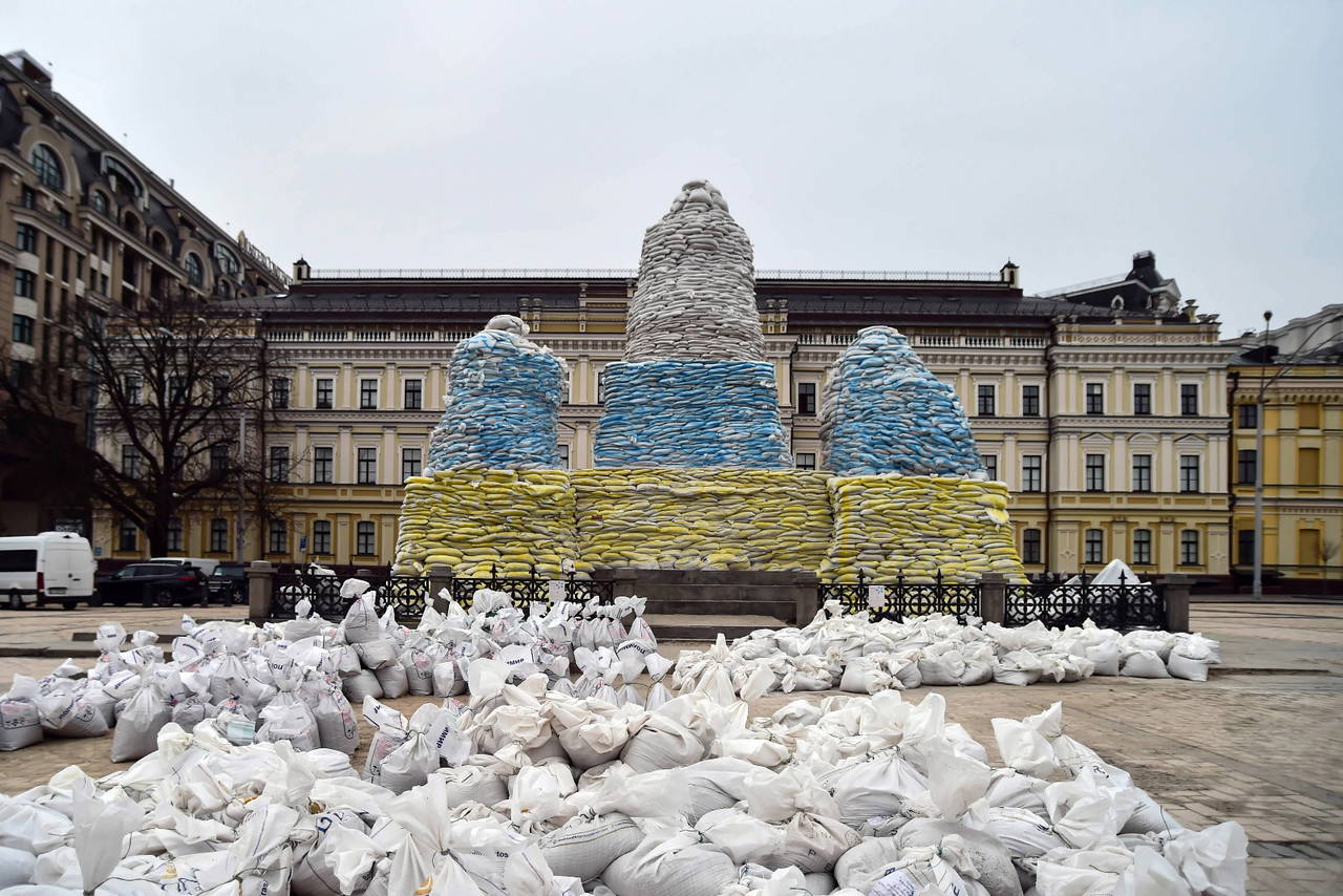 Heykelin etrafı önce brandalarla, daha sonra da Kiev halkı tarafından kum torbalarıyla kapatıldı.