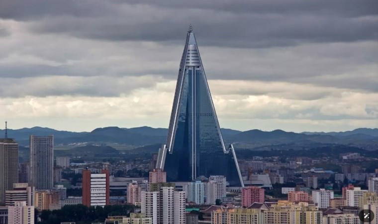 Piramit şeklindeki 3 bin odalı, 105 katlı devasa yapı, daha sonra Pyongyang'ın siluetinde bin metreyi aşan yüksekliğiyle yerini aldı. Ancak yaklaşık 757 milyon dolara (23 milyar 736 milyon TL) mal olmasına rağmen, binadaki ilerleme yıllar boyunca duraksadı.