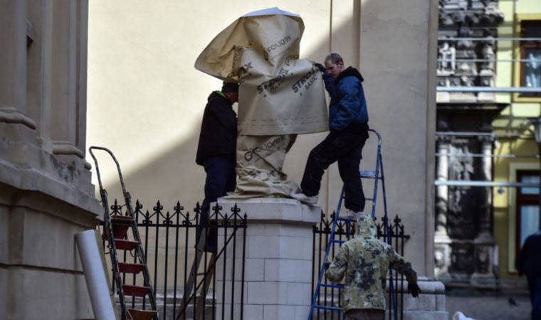 Dün sabah saatlerinde Rusya'nın Ukrayna'nın batısındaki şehirlere yönelik düzenlediği hava saldırılarının ardından Lviv'de önlemler artırılıyor. Kentte bulunan birçok mağaza vitrin camlarını saldırılara karşı korumak için tahta-çelik plakalarla kapatırken, daha önce naylon branda ve süngerlerle kapatılan heykellerin etrafı da bariyerlerle kaplanıyor.