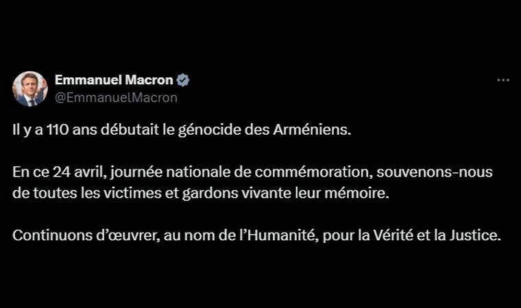 Fransa Cumhurbaşkanı Emmanuel Macron, 1915 olaylarına ilişkin sosyal medya hesabından yaptığı açıklamada 24 Nisan’ı "Ermeni Soykırımı Ulusal Anma Günü" olarak andı.