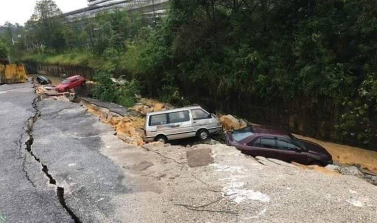 Malezya’nın Selangor eyaletinde etkili olan şiddetli yağışın ardından meydana gelen heyelan nedeniyle bütün bir yol çöktü. 5 aracın çöken yolla birlikte çukura düşmesinin ardından olay yerine çok sayıda ilk yardım ve polis ekipleri geldi.