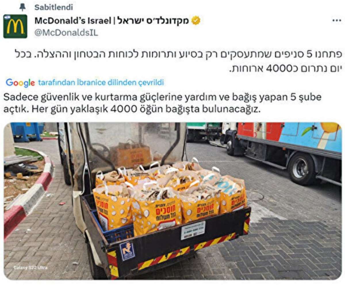 McDonald's İsrail'den yapılan açıklamada, "Sadece güvenlik ve kurtarma güçlerine yardım ve bağış yapan 5 şube açtık. Her gün yaklaşık 4000 öğün bağışta bulunacağız" ifadeleri kullanılmıştı.