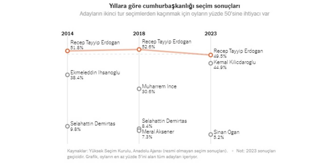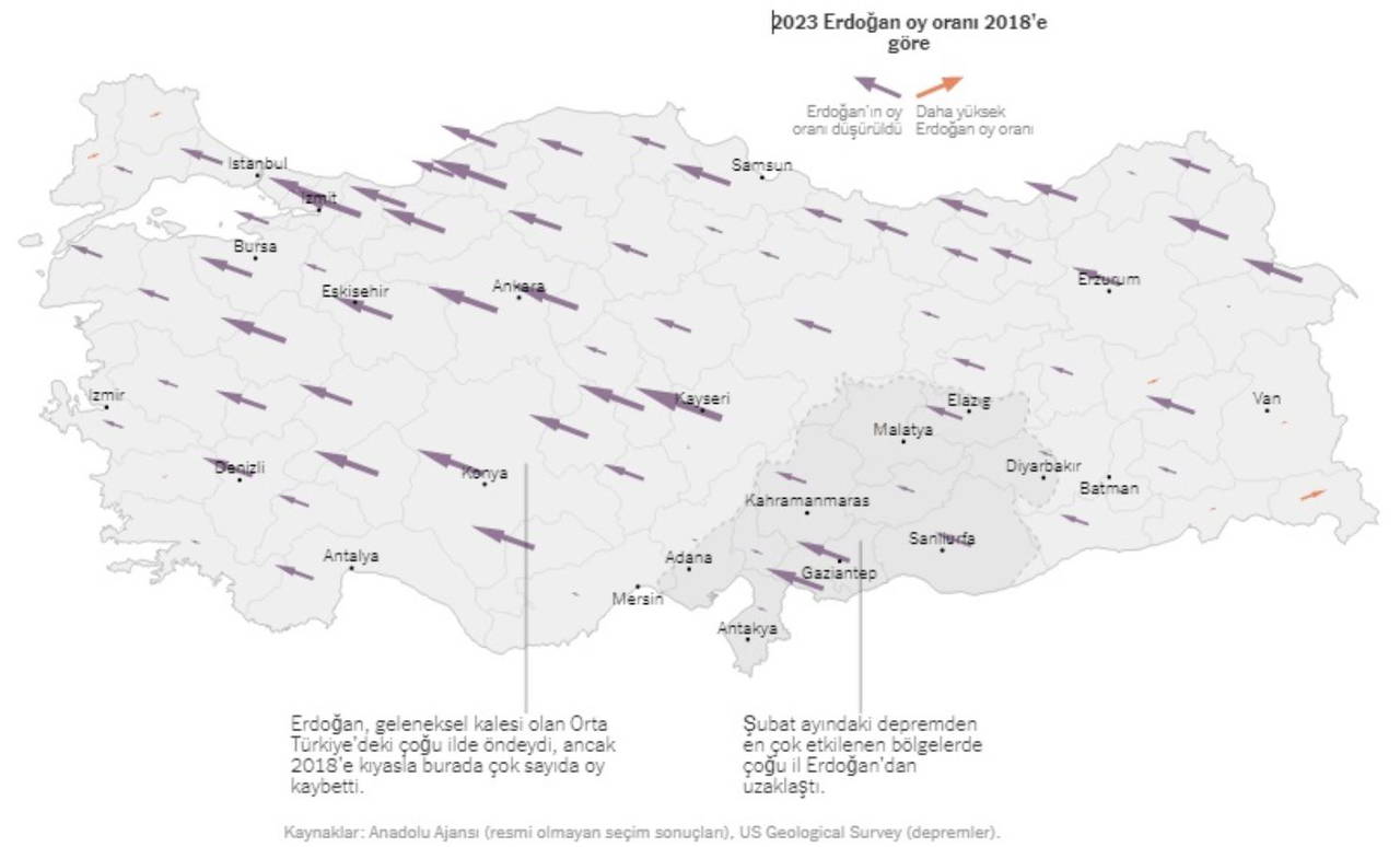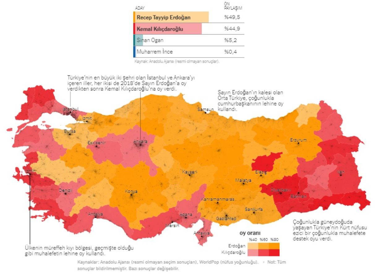 ABD'nin önde gelen gazetelerinden New York Times'ın, "Türkiye Seçim Haritaları: Erdoğan Neden İkinci Tura Kalıyor?" başlıklı bir haberinde Erdoğan'ın Türkiye genelindeki oy düşüşü, harita ve grafikler ile ele alındı.