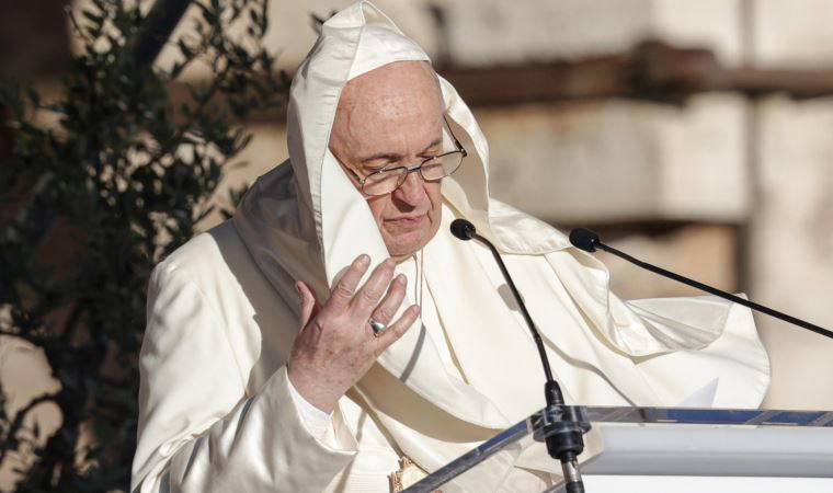 Kısa süreli uğraşının ardından rüzgara karşı verdiği mücadeleyi kazanan Papa, cüppesini düzelterek konuşmasına kaldığı yerden devam etti.