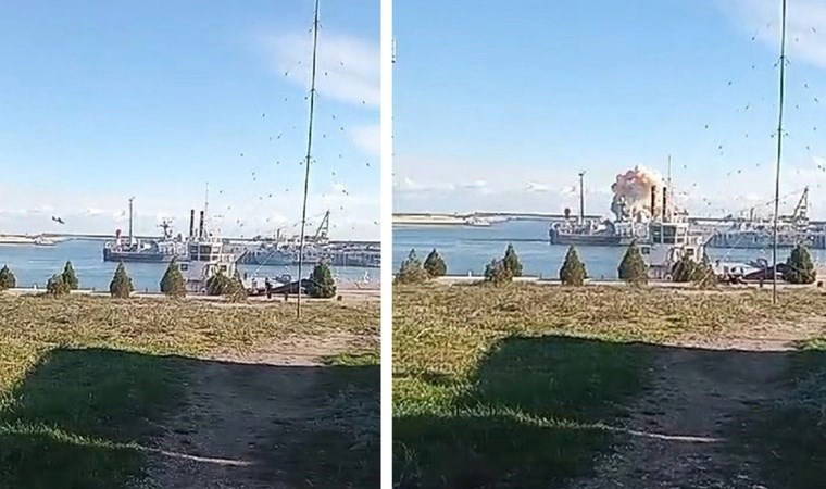 Saldırı anına ait görüntülerde bir dronun Rus kuvvetleri tarafından havada imha edildiği, başka bir dronun ise savaş gemisine isabet ettiği görüldü.