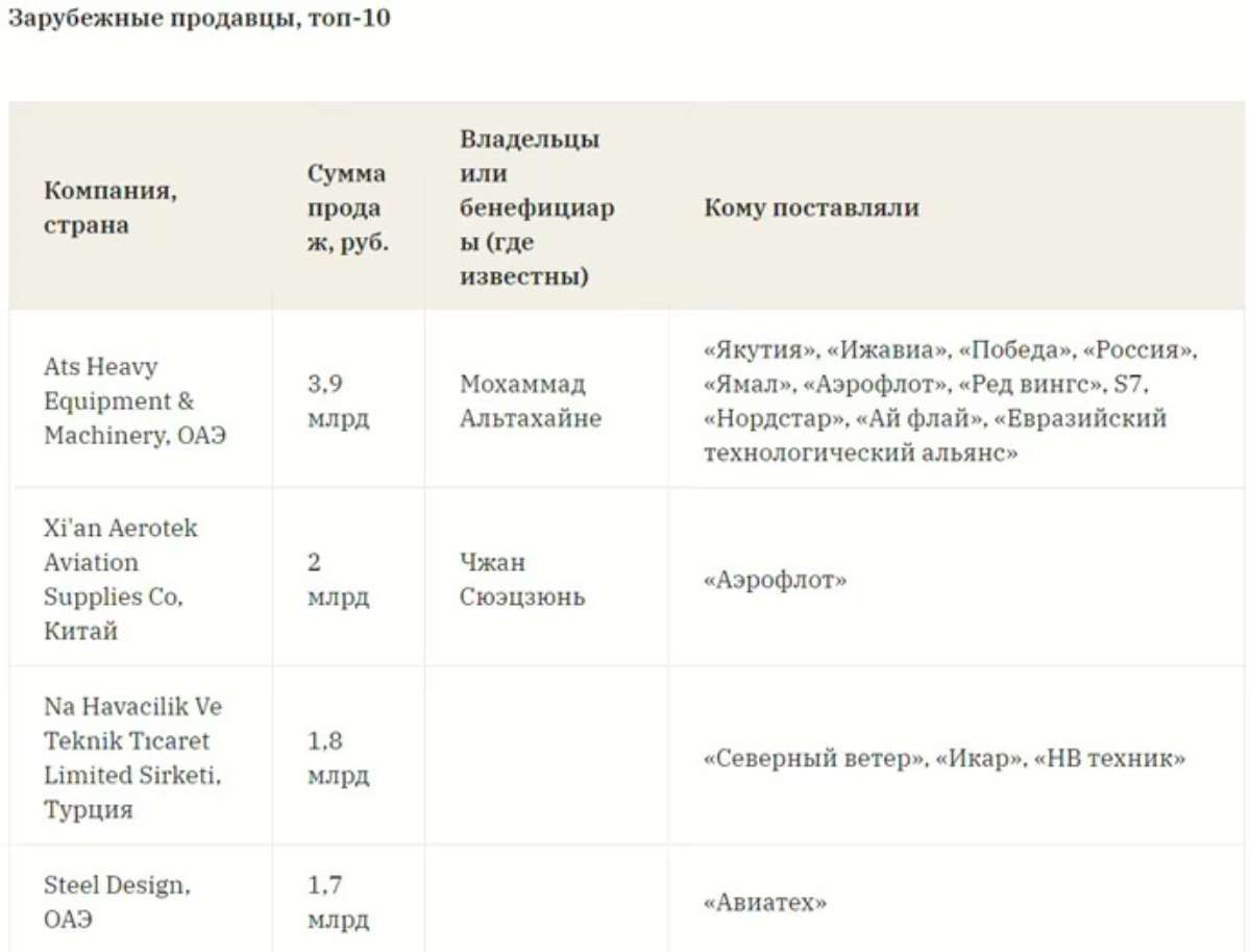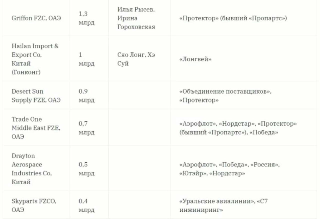 Aynı zamanda, tedarikçi yabancı olabileceği ancak sahiplerinin Rus vatandaşı olduğu kaydedildi. Örneğin, BAE merkezli Griffon şirketi Rusya'ya parça tedariğinde ilk 10'da yer alıyor. Bu tedarikçinin sahiplerinin ise Irina Gorokhovskaya ve Ilya Rysyev adında Rus vatandaşları olduğu belirtildi.