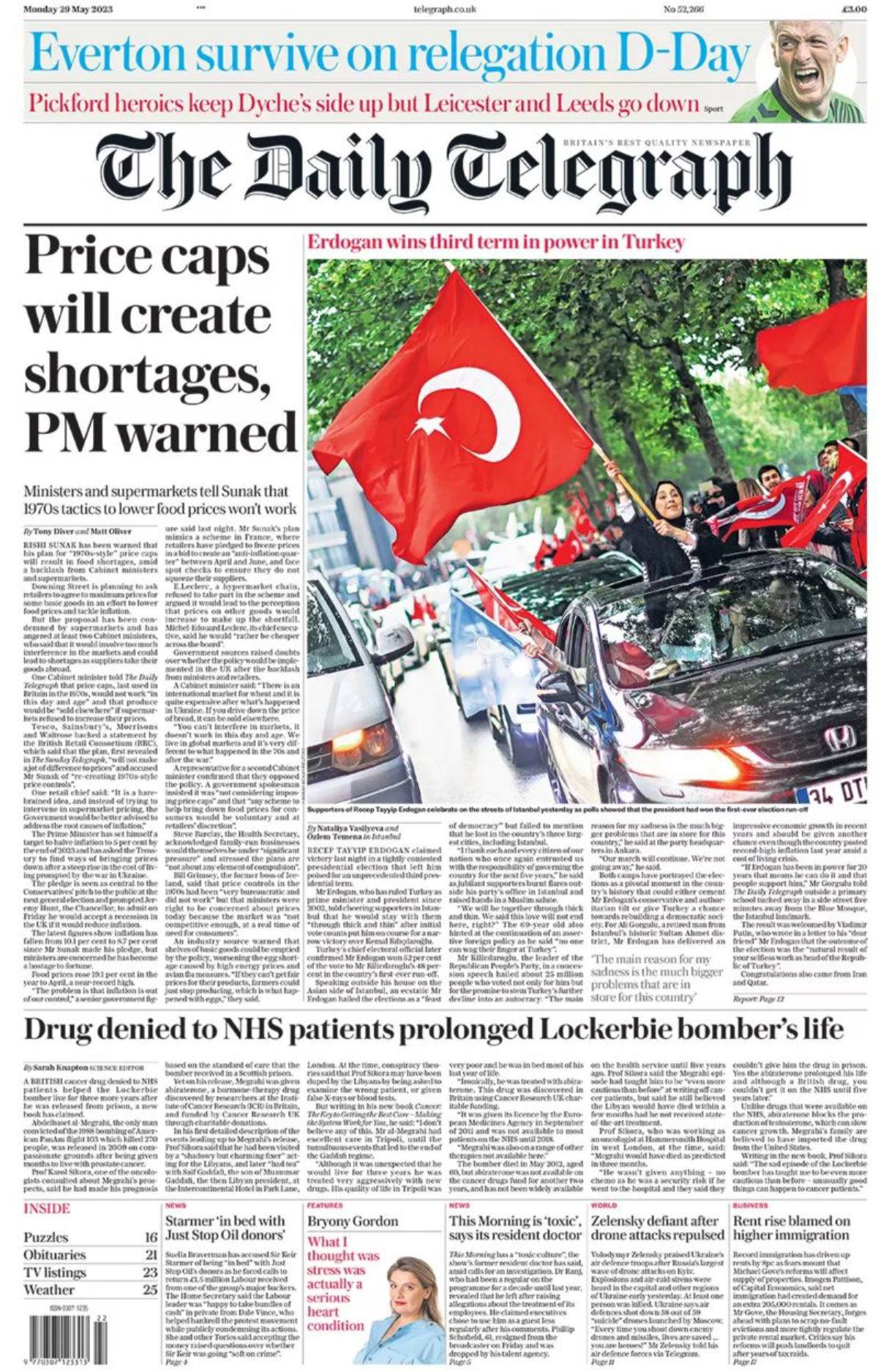Daily Telegraph gazetesi de birinci sayfasında, “Erdoğan üçüncü kez kazandı” başlığını attı ve kutlamalara katılan AKP seçmenlerine ait bir fotoğrafa yer verdi.