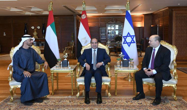 Mısır, İsrail ve Birleşik Arap Emirlikleri (BAE), Mısır’ın Kızıldeniz kıyısındaki Şarm El-Şeyh’te üçlü zirve yaptı. Mısır Cumhurbaşkanı Abdulfettah es-Sisi, İsrail Başbakanı Naftali Bennett ve Birleşik Arap Emirlikleri (BAE) Abu Dabi Veliaht Prensi Şeyh Muhammed bin Zayed El Nahyan’ın bir araya geldiği zirvede, İran, enerji piyasasındaki gelişmeler, gıda güvenliği ile bölgesel ve uluslararası gelişmelerin ele alındığı ifade edildi.