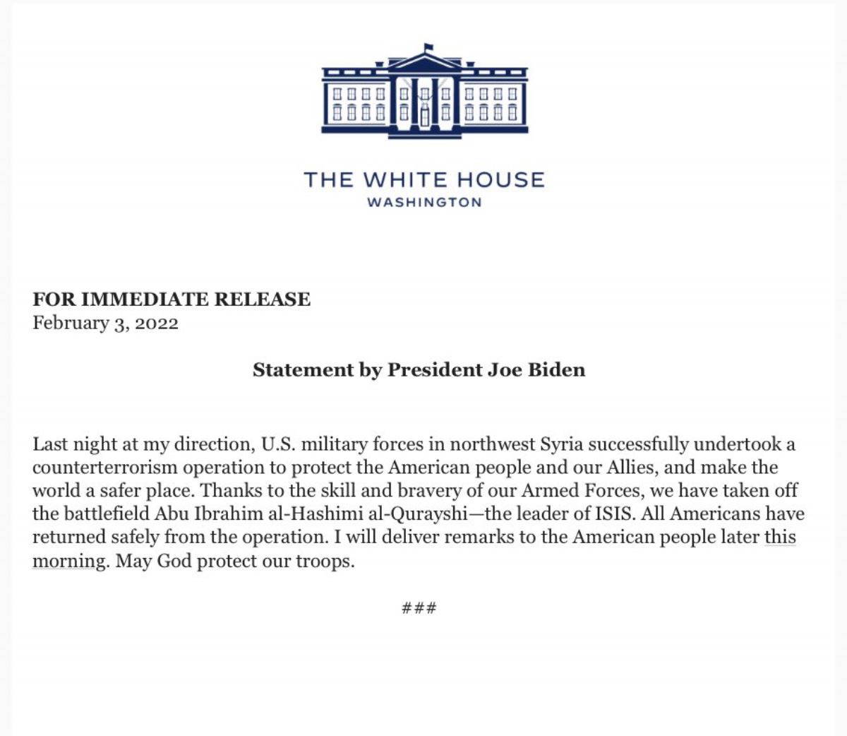 Biden, yaptığı yazılı açıklamada, "Dün gece benim talimatımla, kuzeybatı Suriye'deki ABD güçleri, Amerikan halkını ve müttefiklerimizi korumak ve dünyayı daha güvenli bir yer haline getirmek için başarılı bir terörle mücadele operasyonu gerçekleştirdi. Silahlı Kuvvetlerimizin beceri ve cesareti sayesinde, IŞİD elebaşı Ebu İbrahim el Haşimi el Kureyşi'yi ortadan kaldırdık" ifadeleri kullanıldı.
