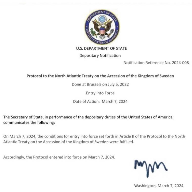 "7 Mart 2024 tarihinde, Kuzey Atlantik Antlaşması'na İsveç Krallığı'nın Katılımına İlişkin Protokol'ün II. maddesinde öngörülen yürürlüğe giriş koşulları yerine getirilmiştir"