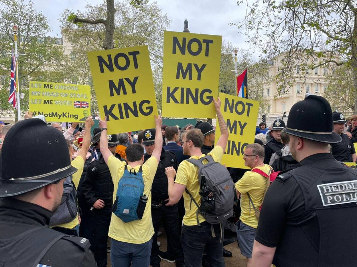 Londra'da "Benim Kralım Değil" pankartları taşıyan monarşi karşıtı guplar ile güvenlik güçleri arasında tartışmalar yaşandı.