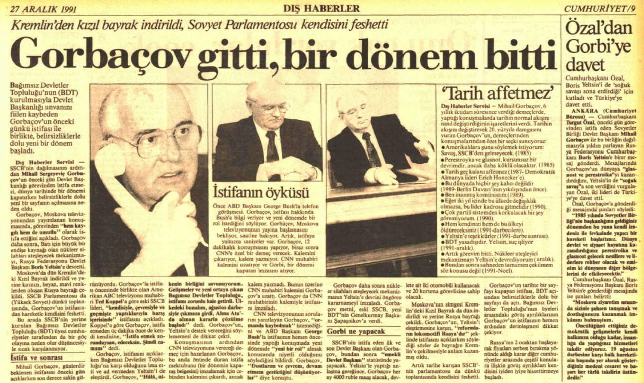 1985’te Sovyetler Birliği Komünist Partisi Genel Sekreterliği’ne gelen Mihail Gorbaçov’un uygulamaya koyduğu glasnost (açıklık) ve perestroyka (yeniden yapılanma) süreçleri sonrası ülkede yaşanan iç çalkantılar ve 1991 Ağustosu’ndaki başarısız darbe girişiminin ardından o dönem Rusya Sovyet Federatif Cumhuriyeti Başkanı Boris Yeltsin, fiilen iktidarı ele aldı. 8 Aralık 1991’de Rusya, Ukrayna ve Belarus federatif cumhuriyetlerinin liderleri Sovyetler Birliği’ne son vererek yerine Bağımsız Devletler Topluluğu’nun (BDT) kurulmasına ilişkin anlaşmayı imzalarken Gorbaçov, 25 Aralık gecesi televizyondan halka seslenerek istifa ettiğini duyurdu. Sovyetler Birliği Yüksek Sovyeti içindeki Cumhuriyet Konseyi 26 Aralık 1991’de Sovyetler Birliği’nin varlığını resmen sona erdiren bildirgeyi kabul etti.